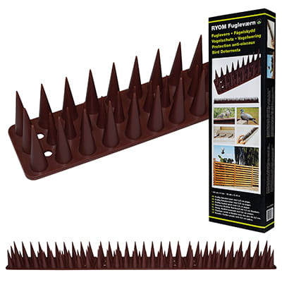 Undgå at fuglene lander på tagryggen, gelænder, stakit eller lign.Fremstillet i kraftig flexibel plast. Med for-borede huller.Monteres nemt på alle underlag.Kan bøjes for nem tilpasning.43 x 4 cm x 12 stk i colorbox = 5,16 m.
