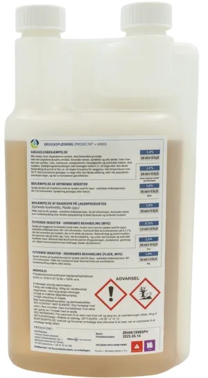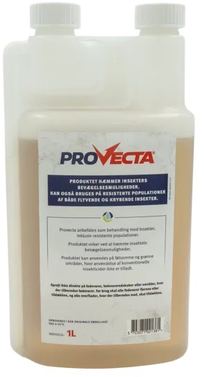 Provecta hæmmer insekters bevægelighed. Midlet sprøjtes direkte på insekter, både flyvende og kravlende, og hæmmer øjeblikkeligt deres bevægelse. Når insekter kommer i kontakt med produktet, skabes der en permanent net-lignende struktur omkring dem, hvilket gør at de ikke kan bevæge sig. Produktet skal sprøjtes direkte på insekterne for optimal virkning. Insektmidlet virker også på resistente populationer, på grund af dets særlige fysiske virkemåde. Produktet har en god udflydningsevne og kan trække langt ind i revner og sprækker. Det kan anvendes på følsomme og grønne områder, hvor anvendelse af konventionelle insekticider ikke er tilladt. Provecta er HACCP-certificeret, hvilket er en international certificering indenfor fødevaresikkerhed. Emballage: 1 liter FILER